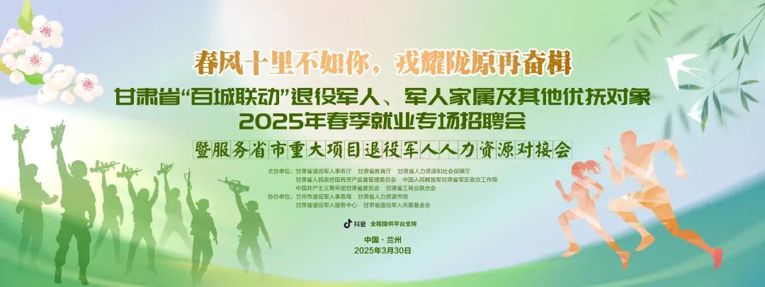 2025年3月30日上午,甘肃省“百城联动”2025年春季退役军人、军人家属及其他优抚对象就业专场招聘会暨服务省市重大项目退役军人人力资源对接会,在省人力资源市场(甘肃省退役军人就业服务市场)举办。此次活动由省退役军人事务厅、省教育厅、省人社厅、省政府国资委、省军区政治工作局、共青团甘肃省委、省工商联七部门联合举办。全省14个市州和兰州新区、86个县市区在相对集中的时间同步开展招聘活动。省退役军人事务厅党组书记、厅长崔进泰,省退役军人事务厅党组成员、副厅长杨元庆,省工商联副主席毛赟,省人社厅二级巡视员李维等参加省级主会场活动。本次专场招聘会旨在深入贯彻党的二十大和二十届三中全会精神,落实落细2025年度重点工作任务,进一步完善退役军人就业扶持体系,促进退役军人、军人家属及其他优抚对象稳定就业,携手为退役军人及军属打造一场职业发展的优抚活动。